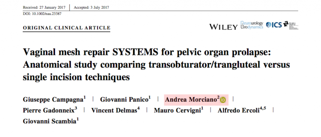 Dalla collaborazione tra la Pia Fondazione “Card. Panico” di Tricase (LE), nella persona del Dott. Andrea Morciano, il Pelvic Floor Center del Policlinico “A. Gemelli” di Roma, l’Università Paris Descartes di Parigi (Francia) e l’Università del Piemonte Orientale di Novara, da poco pubblicato su una delle maggiori riviste internazionali di UroGinecologia “Neurourology and Urodynamics“, uno studio su cadavere con l’utilizzo di differenti sistemi di correzione protesica del Prolasso Pelvico per via vaginale.